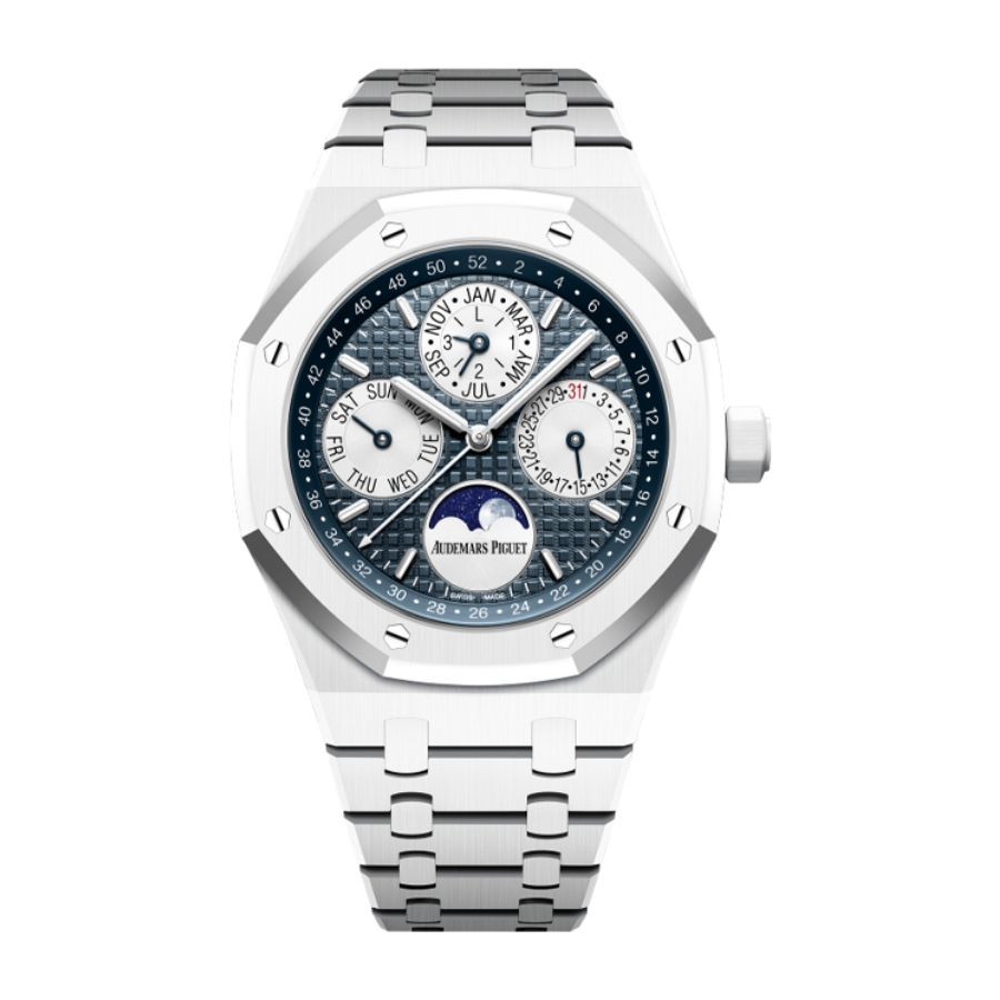 Được chế tác bằng gốm trắng hoàn thiện thủ công, Lịch vạn niên Royal Oak này có ngày, thứ, tháng, mặt trăng thiên văn và tuần trong năm. Dấu hiệu năm nhuận – được Audemars Piguet tiên phong vào năm 1955 – cũng được thể hiện trên mặt số được trang trí “Grande Tapisserie”.