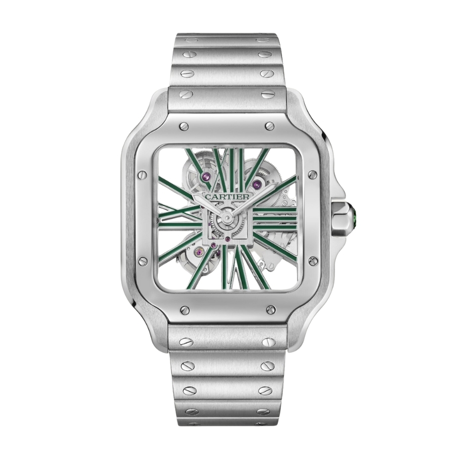 Mặt số của Cartier Santos De Cartier 39.8mm WHSA0028 với các chữ số La Mã màu đen mang tính biểu tượng và kim đồng hồ có hình thanh kiếm, ô cửa sổ xem ngày ở gốc 6h và đế mặt số được hoàn thiện nhiều lớp. Vòng đeo tay bằng thép với hệ thống điều chỉnh “SmartLink”. Dây đeo thứ hai bằng da, có khóa gấp bằng thép. Cả hai dây đeo đều được trang bị hệ thống có thể thay thế “QuickSwitch”. Chiều rộng vỏ: 39,8 mm, độ dày vỏ: 9,08 mm. Chống nước lên đến 100m.