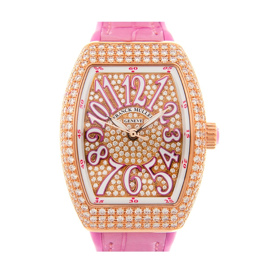Đồng hồ Franck Muller Vanguard V 29 QZ D CD (5N.RS) là một sản phẩm đồng hồ với lớp vỏ được chế tác từ chất liệu Vàng Hồng 18k, có đường kính 29mm và mặt số dáng tonneau (dạng thùng) được Franck Muller khai thác triệt để trong các thiết kế kinh điển của Vanguard, đem lại một tổng thể hoàn hảo và có độ cong hoàn hảo giúp ôm sát cổ tay chủ nhân. Vành Bezel của đồng hồ được hoàn thiện bằng phương pháp đánh bóng quen thuộc, bộ khung bezel đem lại sự mãn nhãn khi được nạm đính kim cương trải dài từ vành bezel vào đến toàn bộ mặt số khiến cho tổng thể đồng hồ trở nên vô cùng thu hút. Franck Muller sử dụng bộ tia, cọc số Ả Rập chỉ giờ quen thuộc đi cùng chiếc đồng hồ được tích hợp dây da ca sấu cao cấp mang tone hồng nữ tính phù hợp với các cọc chỉ số. Mặt kính chất liệu Sapphire với khả năng chống sốc và chống xây xước tuyệt vời thể hiện được rõ ràng cỗ máy cơ khí đẹp mắt hoạt động bên dưới.