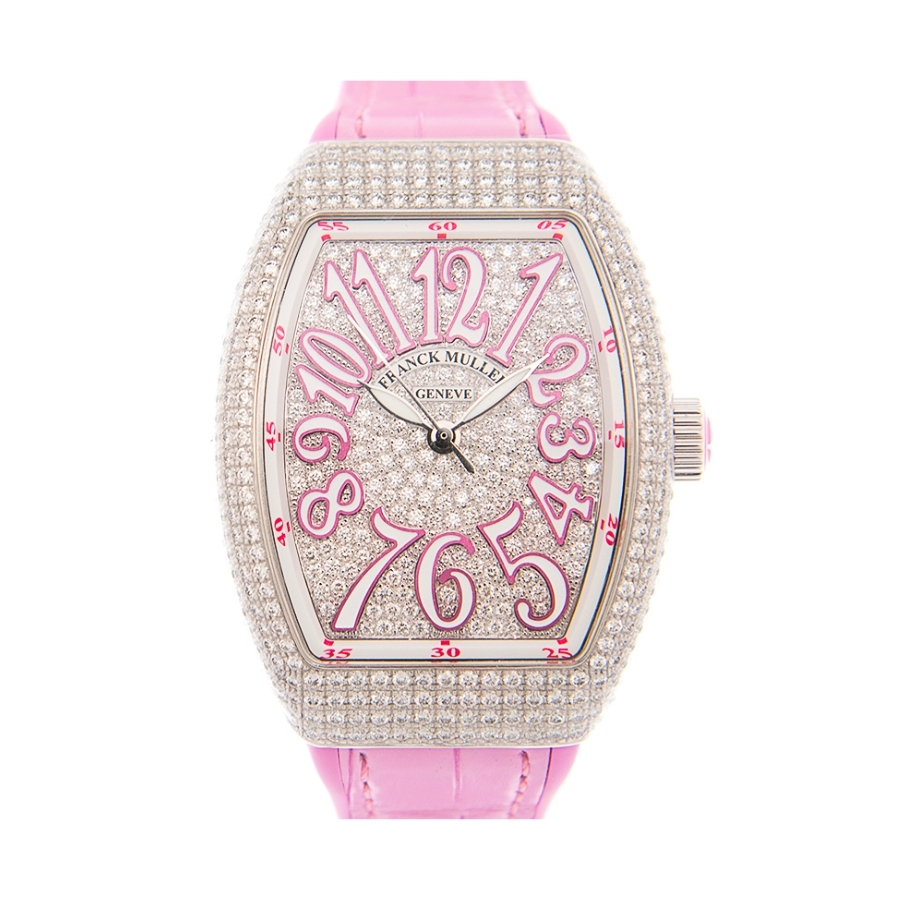 Đồng hồ Franck Muller Vanguard V 35 SC AT FO D CD (AC.RS) là một sản phẩm đồng hồ với lớp vỏ được chế tác từ chất liệu Vàng Hồng 18k, có đường kính 35mm và mặt số dáng tonneau (dạng thùng) được Franck Muller khai thác triệt để trong các thiết kế kinh điển của Vanguard, đem lại một tổng thể hoàn hảo và có độ cong hoàn hảo giúp ôm sát cổ tay chủ nhân. Vành Bezel của đồng hồ được hoàn thiện bằng phương pháp đánh bóng quen thuộc, bộ khung bezel đem lại sự mãn nhãn khi được nạm đính kim cương trải dài từ vành bezel vào đến toàn bộ mặt số khiến cho tổng thể đồng hồ trở nên vô cùng thu hút. Franck Muller sử dụng bộ tia, cọc số Ả Rập chỉ giờ quen thuộc đi cùng chiếc đồng hồ được tích hợp dây da ca sấu cao cấp mang tone hồng nữ tính phù hợp với các cọc chỉ số. Mặt kính chất liệu Sapphire với khả năng chống sốc và chống xây xước tuyệt vời thể hiện được rõ ràng cỗ máy cơ khí đẹp mắt hoạt động bên dưới.