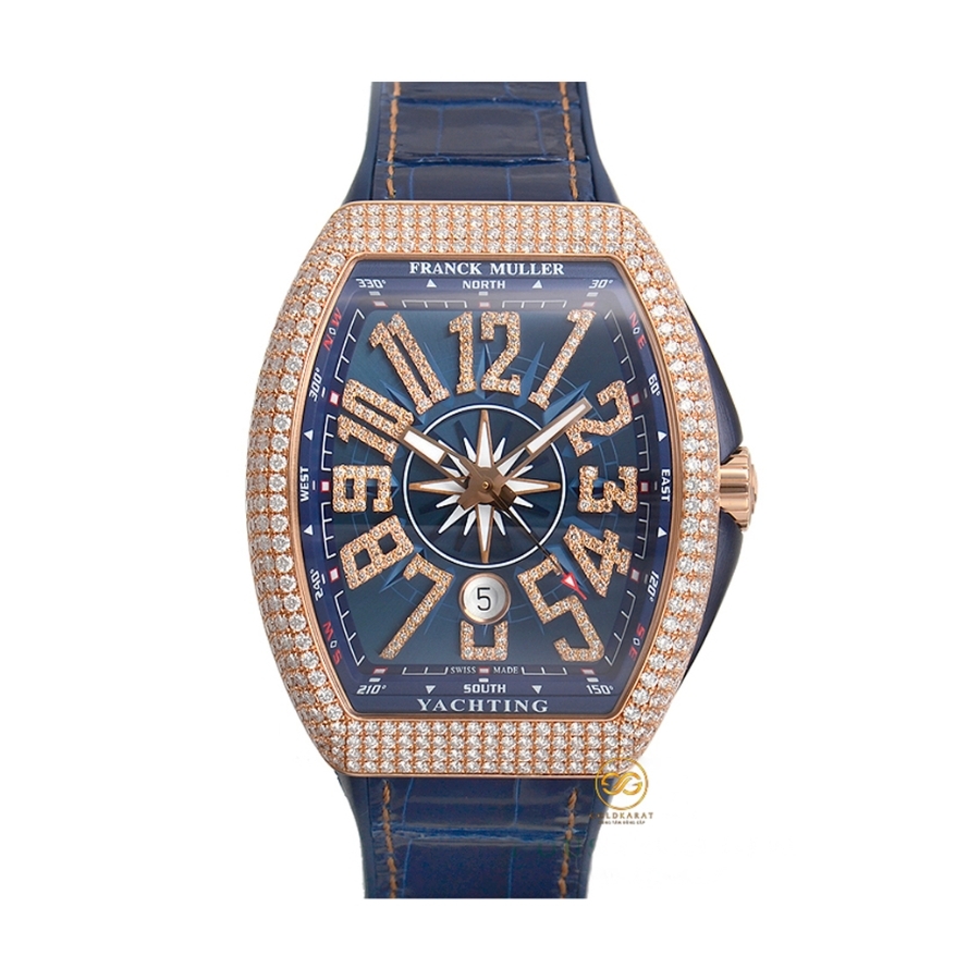 Đồng hồ Franck Muller Vanguard V 45 SC DT D NBR CD YACHTING (5N.BL) là một sản phẩm đồng hồ với lớp vỏ được chế tác từ chất liệu Vàng Hồng 18k, có đường kính 45mm và mặt số giữ nguyên dáng vỏ Cintree Curvex được Franck Muller khai thác triệt để trong các thiết kế kinh điển của Vanguard, đem lại một tổng thể hoàn hảo và có độ cong hoàn hảo giúp ôm sát cổ tay chủ nhân. Vành Bezel của đồng hồ được hoàn thiện bằng phương pháp đánh bóng quen thuộc, bộ khung bezel đem lại sự xa hoa bậc nhất khi khoác lên mình hàng trăm viên kim cương Brilliant Cut thu hút mọi ánh nhìn . Franck Muller sử dụng bộ tia, cọc số Ả Rập chỉ giờ quen thuộc nhưng vẫn không quên cho sự xuất hiện của những viên kim cương bên trên những chỉ số để tăng thêm phần nổi bật. Mặt kính chất liệu Sapphire với khả năng chống sốc và chống xây xước tuyệt vời thể hiện mặt số đặc biệt của dòng Yachting được thiết kế lấy cảm hứng từ bộ môn đua thuyền buồm, màu xanh lam được lấy làm tone màu chính khi thể hiện được hình ảnh của đại dương mênh mông. Ở trung tâm đồng hồ là biểu tượng bông hoa gió đặc trưng thể hiện hướng và sức gió trên bản vẽ, tuy nhiên đối với phiên bản Yachting biểu tượng này chỉ mang sử dụng nhằm mục đich thẩm mỹ chứ không phục vụ quy ước như những phiên bản khác.