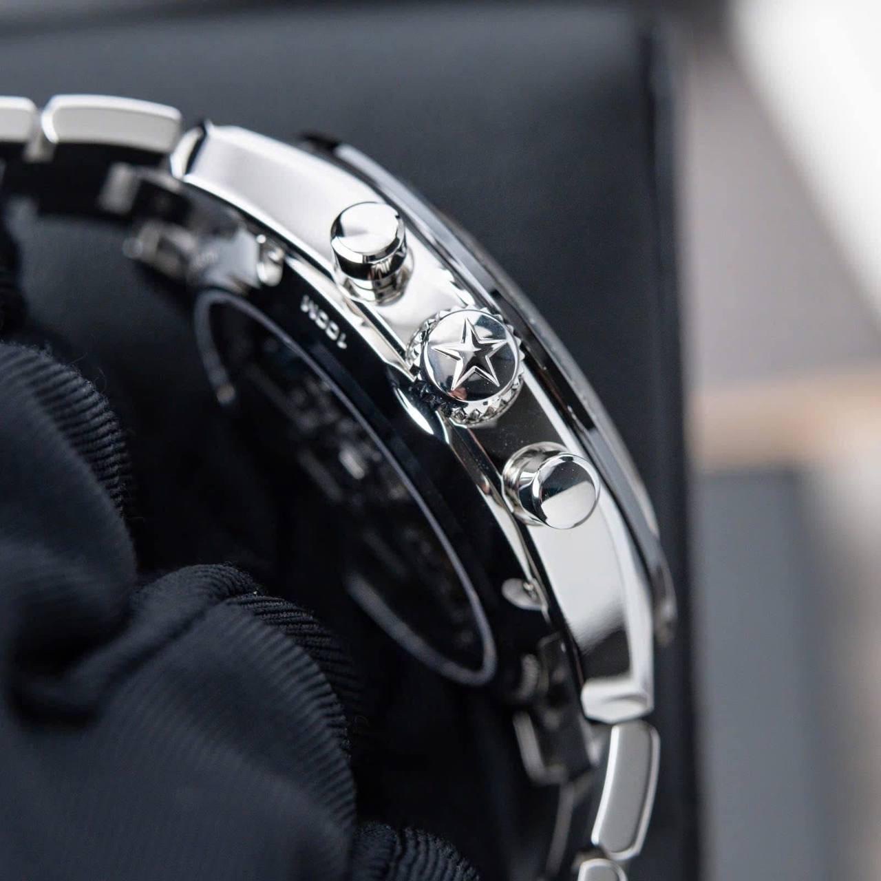 Sở hữu thiết kế mạnh mẽ với mặt số đen sang trọng và dây đeo thép không gỉ, đây là lựa chọn hoàn hảo cho quý ông hiện đại.