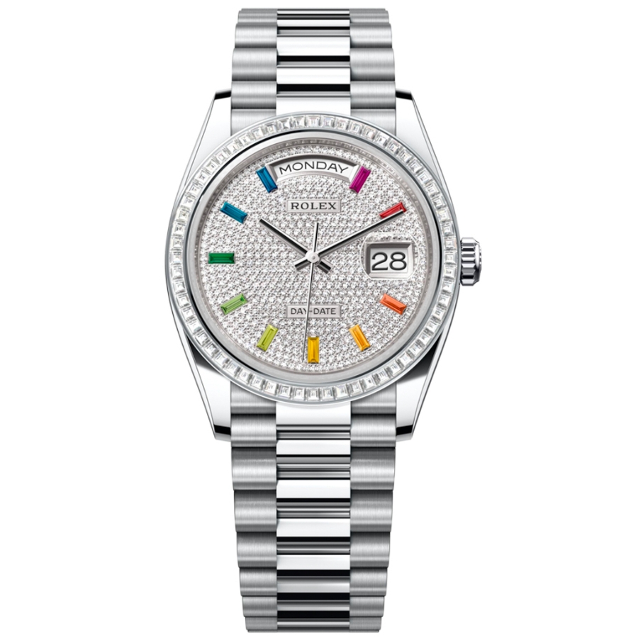 Đồng hồ Rolex Daydate 36 128396TBR-0006 Mặt Số Kim Cương Màu Bạc Dây Đeo President Thép là một mẫu đồng hồ lịch lãm và cổ điển dành cho phái nam của Rolex, sở hữu bộ vỏ sang trọng bậc nhất được khi gia công bằng chất liệu Vàng Trắng 18k, với dáng mặt số tròn kích thước 36mm lấy vẻ đẹp từ sự lấp lánh và xa xỉ của những viên kim cương làm chủ đạo, đặc biệt ở vành bezel còn được nhà sản xuất nạm đính thêm hàng loạt viên kim cương mang lại nét đẹp thẩm mỹ và xa xỉ của toàn bộ chiếc đồng hồ. Ô cửa sổ hiển thị ngày ở góc 3 giờ được trang bị ống kính Cyclops phóng đại đi cùng cọc số kim cương được làm nổi bật ở vị trí 6h và 9h đầy bắt mắt. Mặt kính chất liệu Sapphire với khả năng chống sốc và chống xây xước tuyệt vời. Dây đeo President liên kết 3 mảnh thành hình bán nguyệt tạo sự thanh lịch và sang trọng.