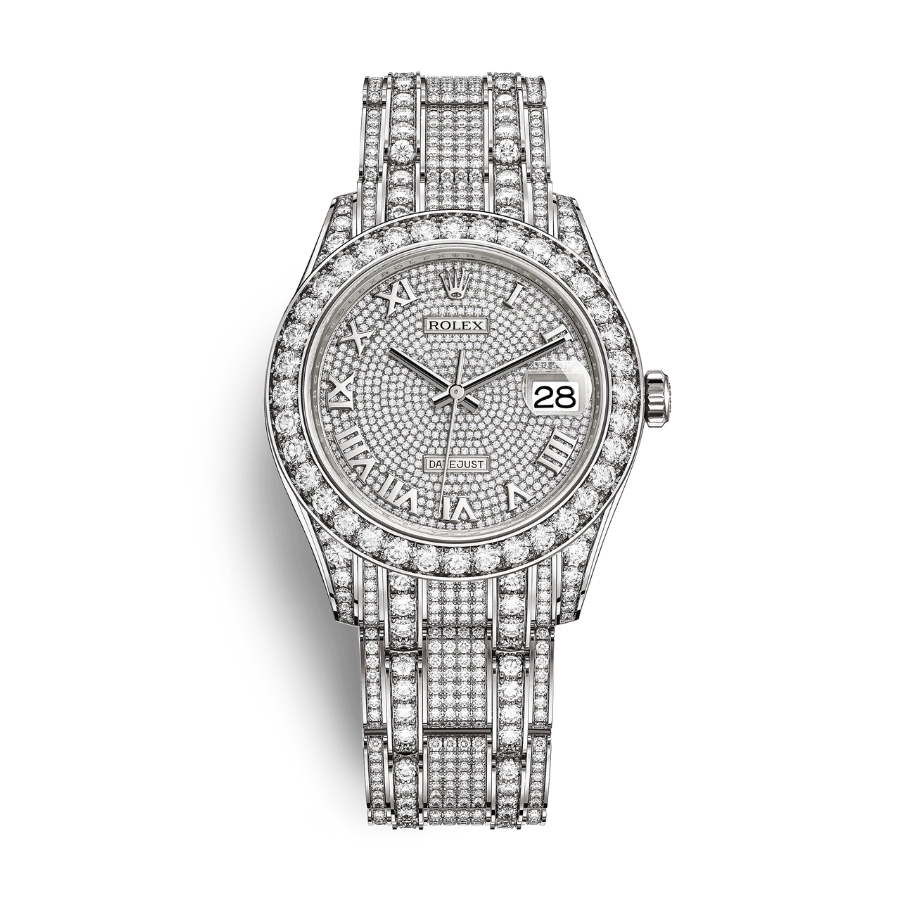 Đồng hồ Rolex Pearlmaster 39 86409rbr-0001 Mặt Số Kim Cương Dây Đeo Pearlmaster Vàng Trắng là chiếc đồng hồ nữ sở hữu bộ vỏ được gia công bằng chất liệu Vàng Trắng 18k sang trọng hàng đầu của Rolex, với dáng mặt số tròn kích thước 39mm tương đối to so với cổ tay phái nữ nhưng lại khiến tổng thể trở nên vô cùng nổi bật. Toàn bộ đồng hồ được khảm kim cương thiên nhiên có độ tinh khiết cao trải dài từ mặt số ra đến dây đeo. Ô cửa sổ hiển thị ngày ở góc 3 giờ được trang bị ống kính Cyclops phóng đại đi cùng cọc số La Mã đầy bắt mắt đặc biệt thay thế góc 4 giờ bằng chỉ số IIII thay vì IV như thường lê. Mặt kính chất liệu Sapphire với khả năng chống sốc và chống xây xước tuyệt vời. Dây đeo Jubilee 5 mối nối tạo sự thanh lịch và sang trọng.
