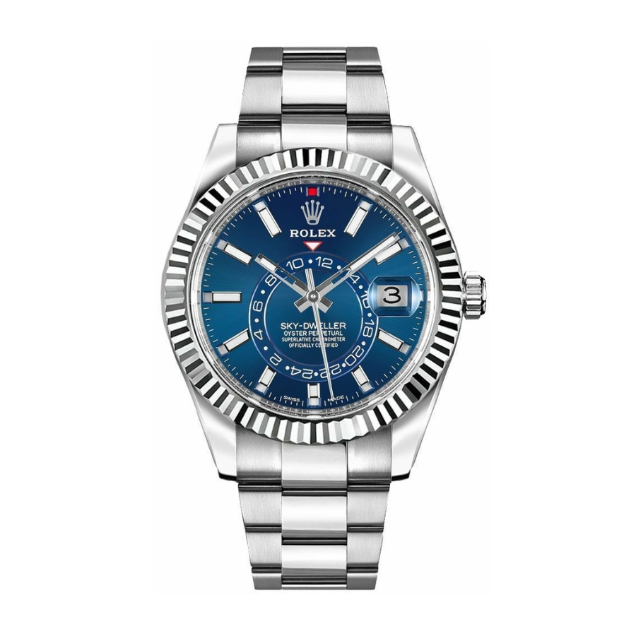 Oyster Perpetual Sky-Dweller bằng Oystersteel và vàng trắng với mặt số màu xanh lam sáng và dây đeo Oyster.Chiếc đồng hồ đặc biệt này có đặc điểm là hiển thị múi giờ thứ hai trên một đĩa lệch tâm trên mặt số. Hơn nữa, hệ thống sáng tạo để thiết lập các chức năng, sử dụng vòng bezel có thể xoay được, là duy nhất của Rolex.
