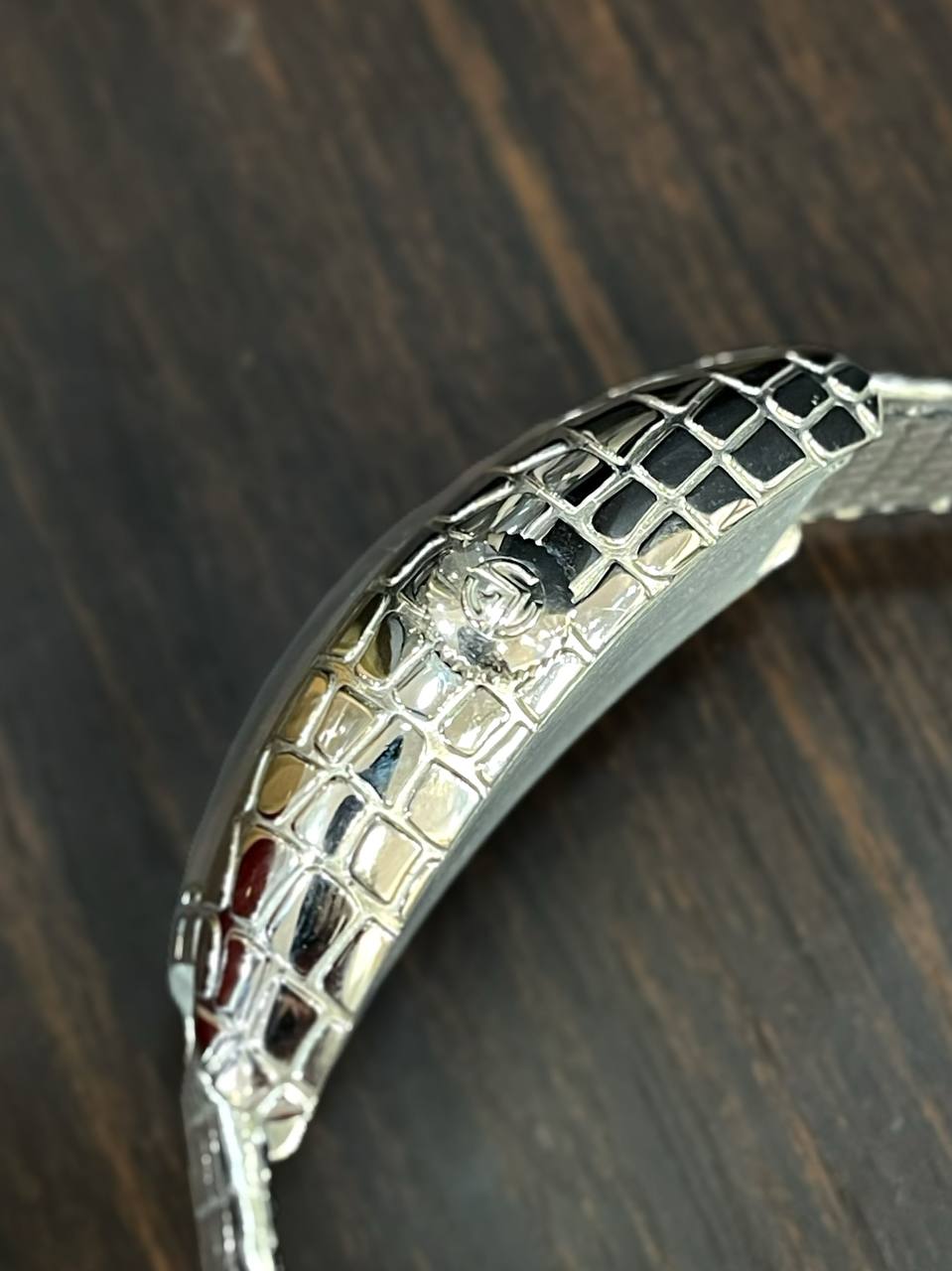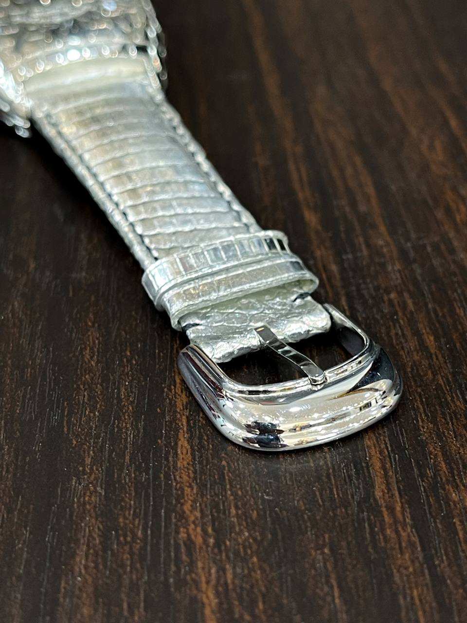 Chất liệu: Thép không gỉ và da cá sấu bạc.