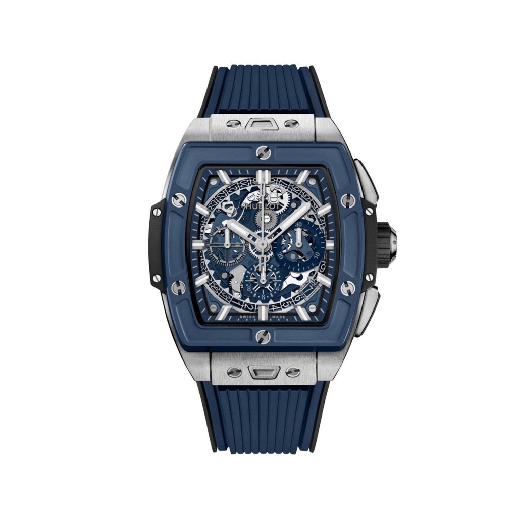 Điểm nhấn đặc biệt của Hublot Spirit Of Big Bang 42mm 642.NL.7170.RX này chính là sự kết hợp với gốm sứ xanh trên vành bezel. Gốm sứ xanh không chỉ mang lại vẻ đẹp sang trọng mà còn có khả năng chống trầy xước và chịu nhiệt tốt. Màu xanh đậm của gốm sứ tạo nên sự tươi mới và nổi bật, thu hút mọi ánh nhìn.