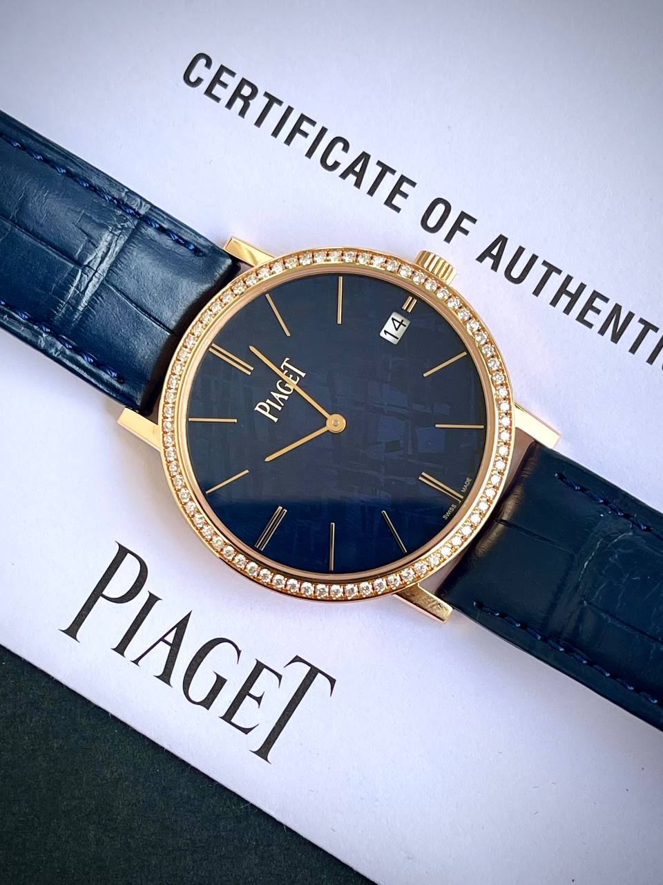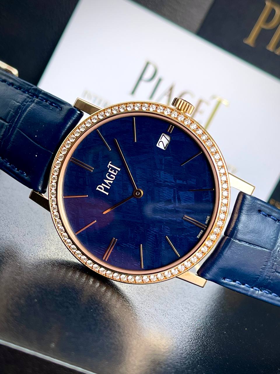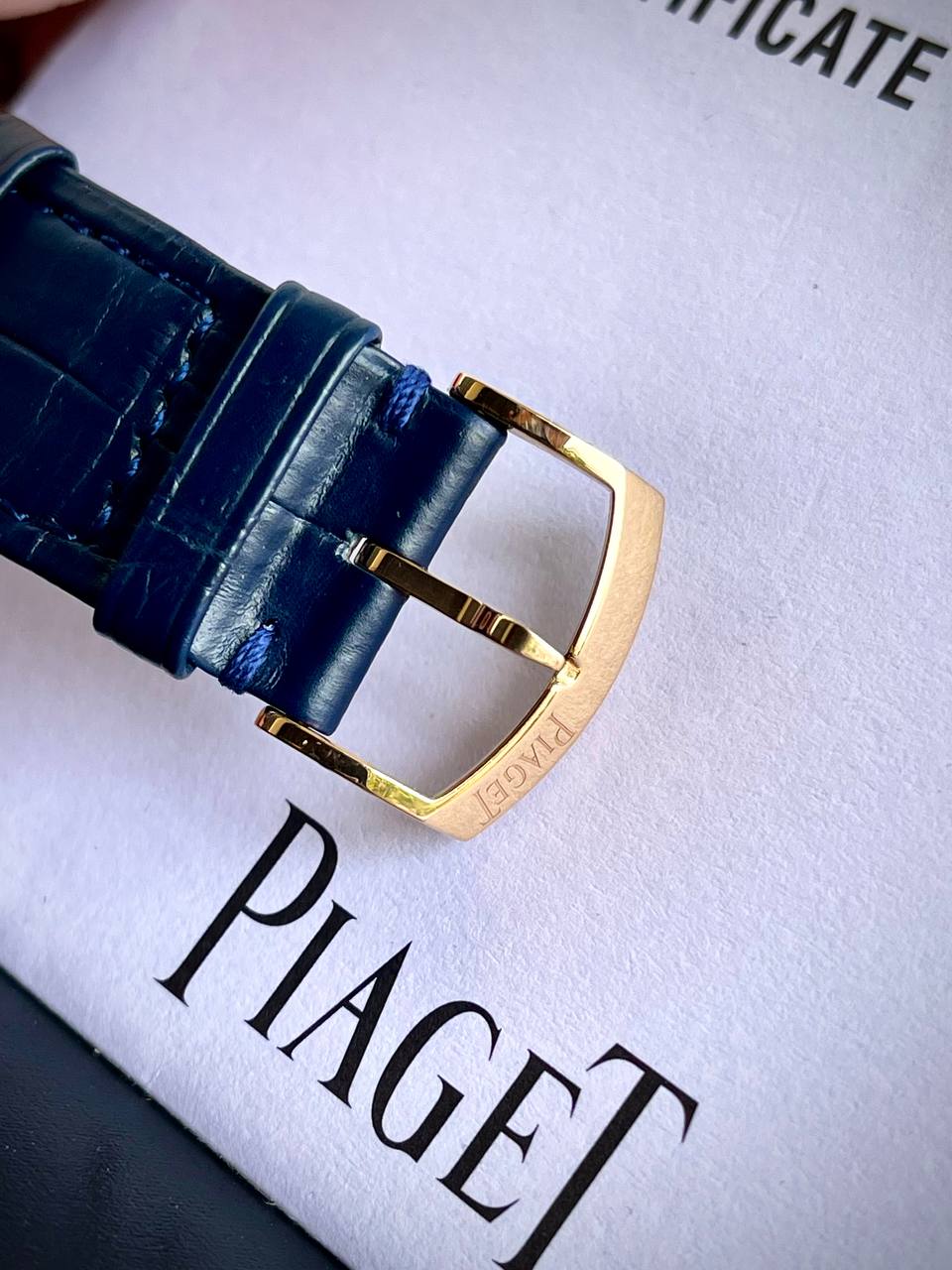 Kết hợp với bộ vỏ vàng khối là sợi dây da, được gắn với phần càng nối dây thẳng. Sợi dây da mềm mại, đơn giản cũng giúp cho người dùng tập trung hơn vào vành bezel được trang trí bởi những viên kim cương Brilliant Cut lấp lánh. Chất liệu da được sử dụng bởi Piaget là da cá sấu ở phía trên, lót thêm một lớp da bê ở phía dưới. Sợi dây được cố định bởi khóa cài bằng vàng hồng đơn giản mà tinh tế.