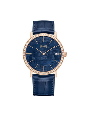 Thay vì màu xám như những mặt số thiên thạch thông thường, phiên bản này sở hữu mặt số với màu xanh lam cực kỳ đặc biệt. Tông màu xanh kết hợp hoàn hảo với màu của sợi dây da, đồng thời tương phản với chất liệu vàng khối ở cọc số và kim que. Hệ thống chỉ giờ được thiết kế đơn giản với dáng baton mảnh dẻ, nhấn mạnh thêm thiết kế thanh lịch, truyền thống của chiếc đồng hồ.