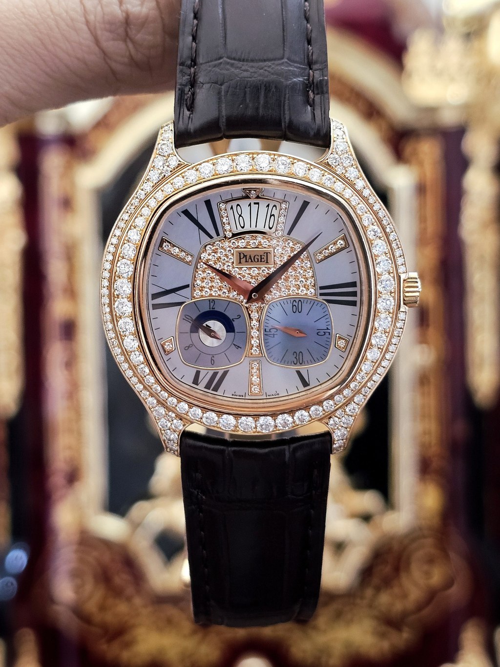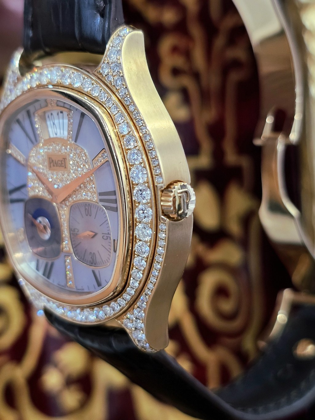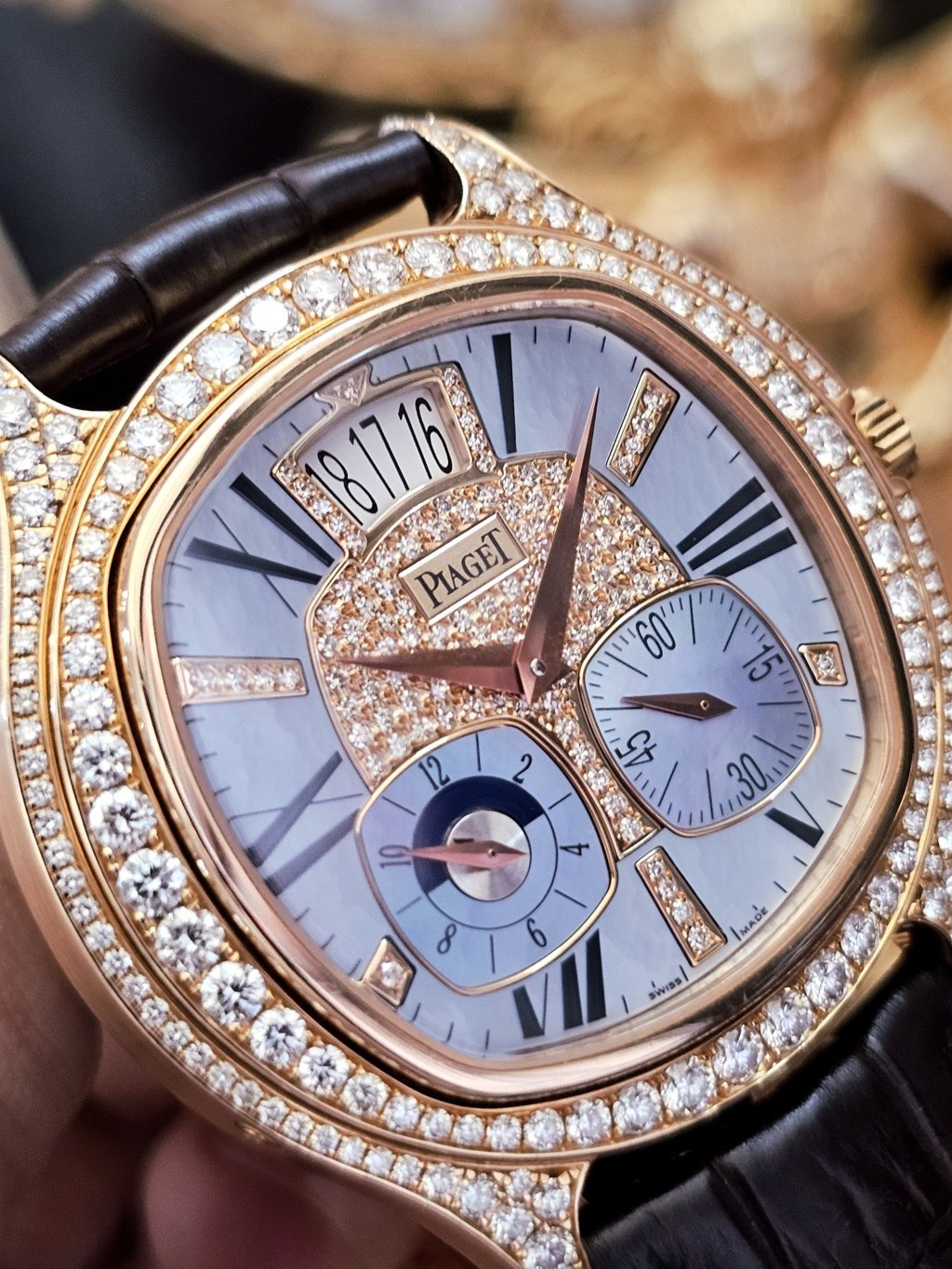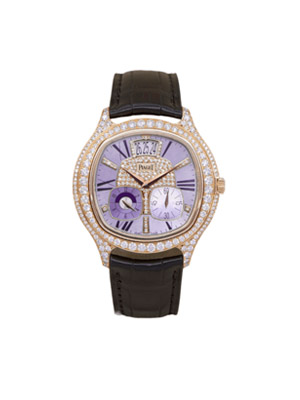 Cách sắp xếp đi viền kim cương to nhỏ cùng vị trí trung tâm hay xen các cọc chỉ giờ vừa lạ mắt vừa như một nét chấm phá riêng biệt ấn tượng khi nghĩ đến Piaget. Hiệu ứng giữa vàng hồng mặt xà cừ cùng kim cương cho chiều sâu cùng độ tương phản rực rỡ khi lên tay chủ nhân của nó.