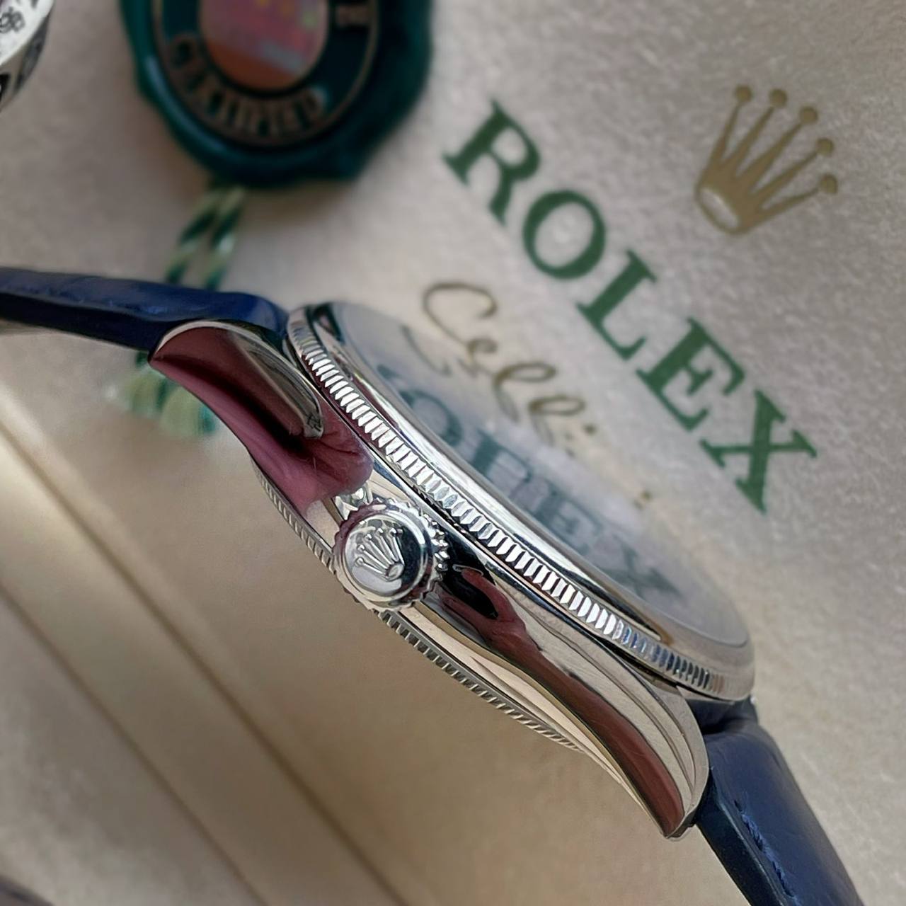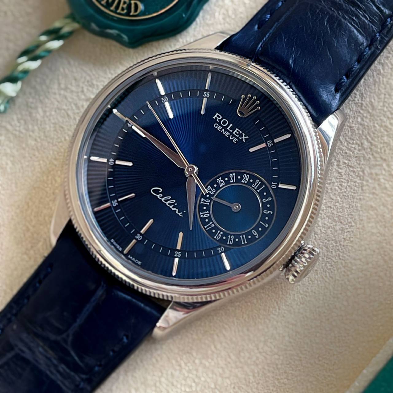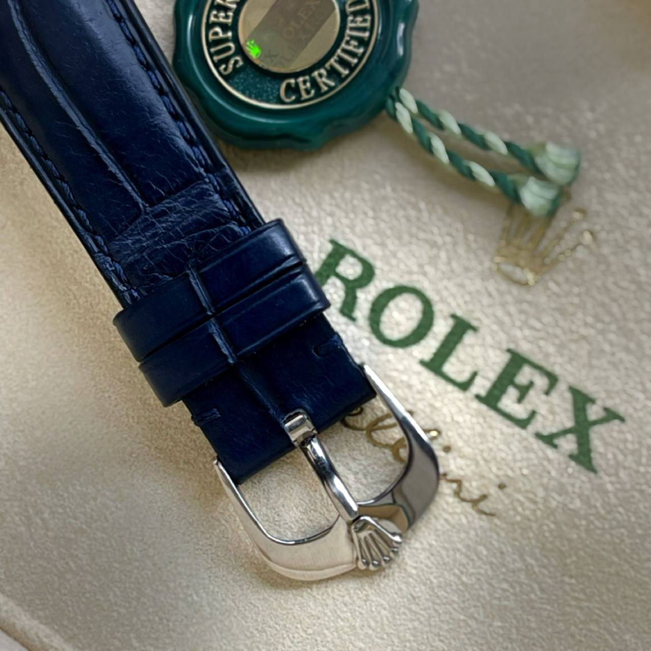 Phối hợp cùng mặt số xanh của phiên bản đồng hồ Rolex Cellini Date ref. 50519 là dây đeo da màu xanh thẫm, gắt chặt cùng càng nối dây dẹt, mỏng của mẫu đồng hồ. Cố định cả chiếc đồng hồ trên cổ tay là khóa cài chắc chắn bằng vàng phía cuối dây đeo.