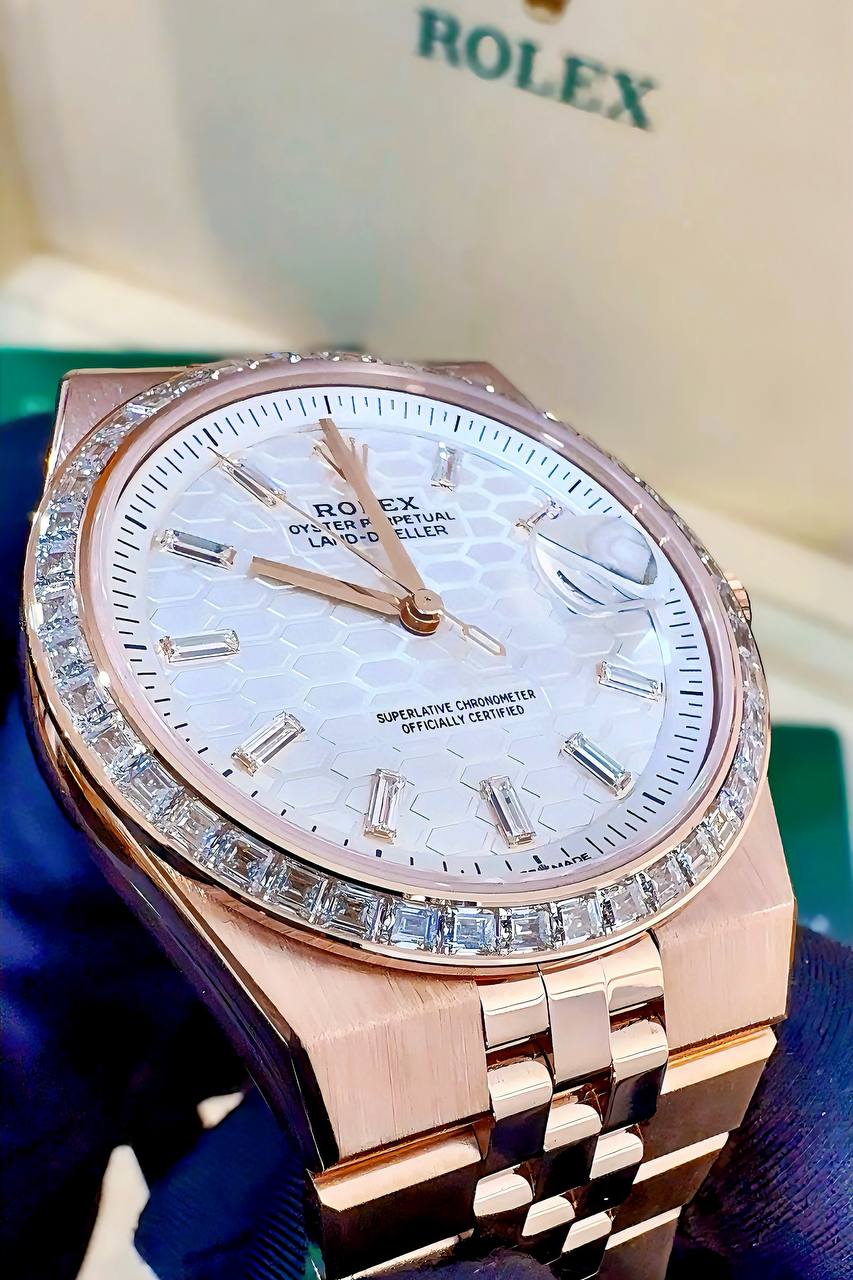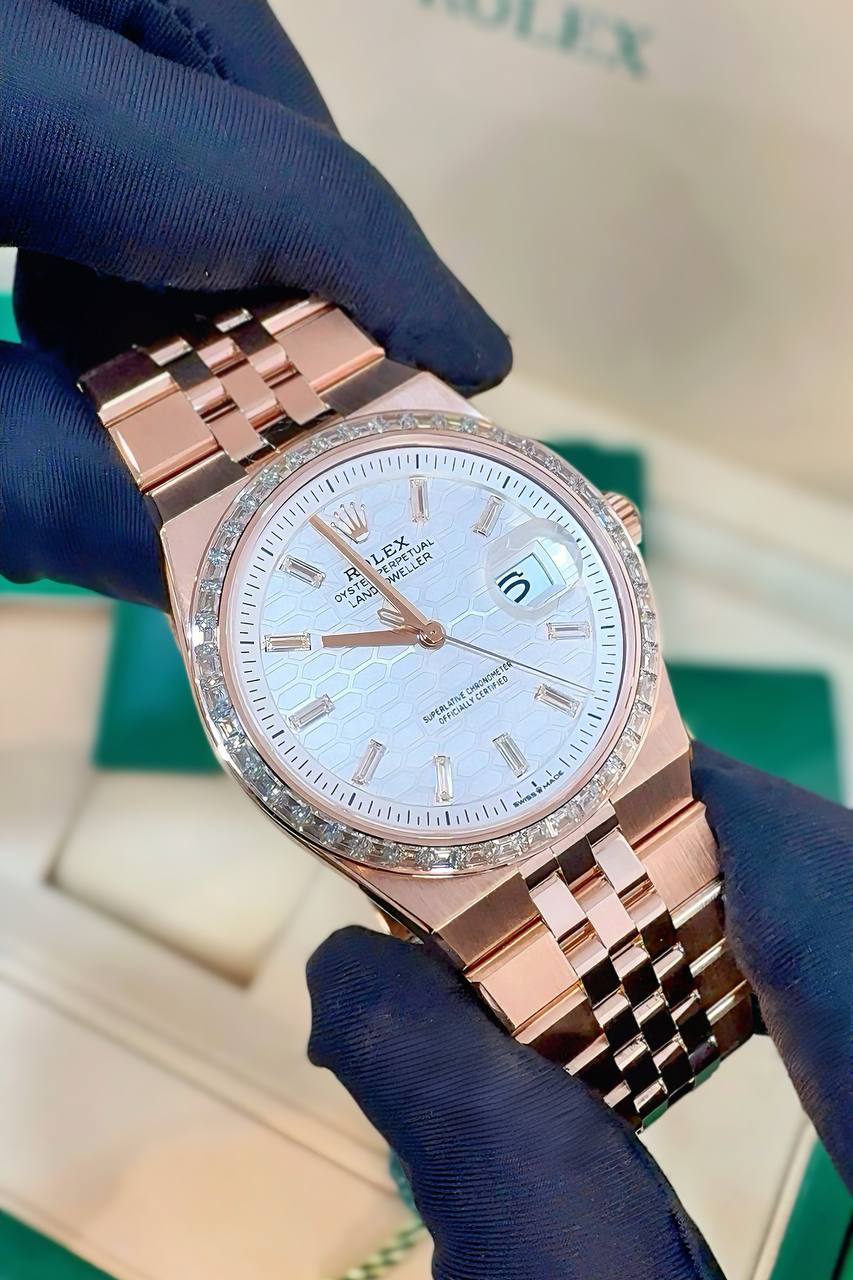 Vành Bezel "TBR" (Taille Baguette Révolution): Điểm đắt giá nhất chính là vành bezel nạm kim cương ống (Baguette-cut). Rolex đã sử dụng kỹ thuật nạm ẩn (channel setting) khiến các viên kim cương xếp liền kề nhau như một dòng chảy ánh sáng, không hề lộ các chấu giữ bằng kim loại.